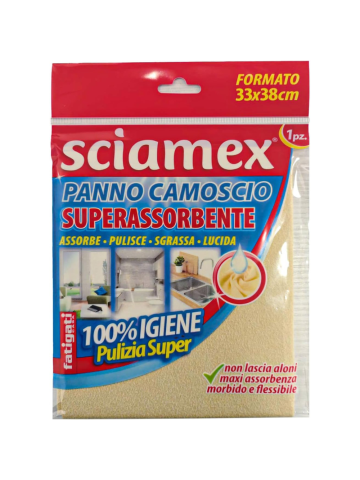 Il panno superassorbente Sciamex è un prodotto indispensabile per la pulizia della casa. Questo panno camoscio è realizzato con materiali di alta qualità che assorbono efficacemente liquidi e sporco, lasciando le superfici pulite e lucide. Con le sue dimensioni di 33×38 cm, è perfetto per pulire piani di lavoro, finestre, specchi e altri oggetti. Grazie alla sua morbidezza e flessibilità, non lascia aloni e si adatta facilmente a tutte le superfici. Assorbe rapidamente e in modo igienico, garantendo una pulizia profonda e una massima assorbenza. Comodo e pratico, il panno Sciamex è la soluzione ideale per mantenere la tua casa sempre splendente.